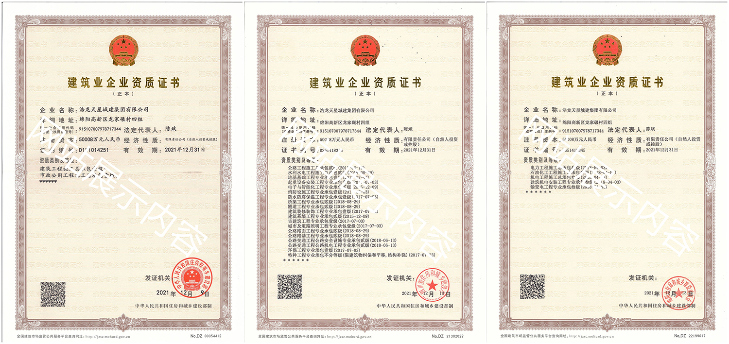 浩龍?zhí)煨浅墙瘓F(tuán)有限公司,2007年成立于“李白故鄉(xiāng)、中國(guó)科技城”—四川省綿陽(yáng)市,企業(yè)注冊(cè)資本金5.0008億元。公司共有27項(xiàng)建筑業(yè)企業(yè)資質(zhì),其中國(guó)家一級(jí)資質(zhì)11項(xiàng),二級(jí)資質(zhì)10項(xiàng),三級(jí)資質(zhì)5項(xiàng),特種資質(zhì)不分等級(jí)1項(xiàng),類別涵蓋建筑、市政、水利、機(jī)電、隧道、起重設(shè)備安裝等基礎(chǔ)及未來(lái)發(fā)展重點(diǎn)專業(yè)。公司...